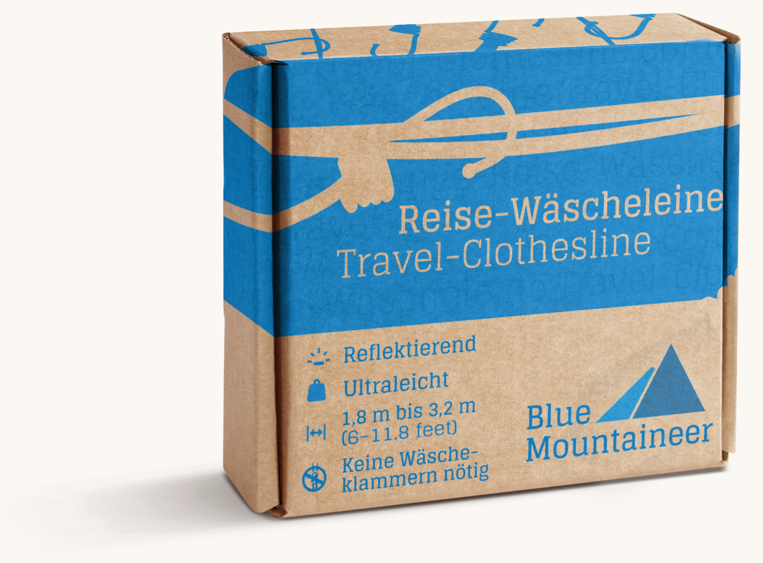 Das Verpackungslayout für die Wäscheleine setzt auf minimalistisches Design mit klarer Typografie und gut lesbaren Infos. Eine einfache Illustration der Wäscheleine sorgt für visuelle Klarheit, während das Layout durch dezente Farben und klare Linien modern und übersichtlich bleibt.