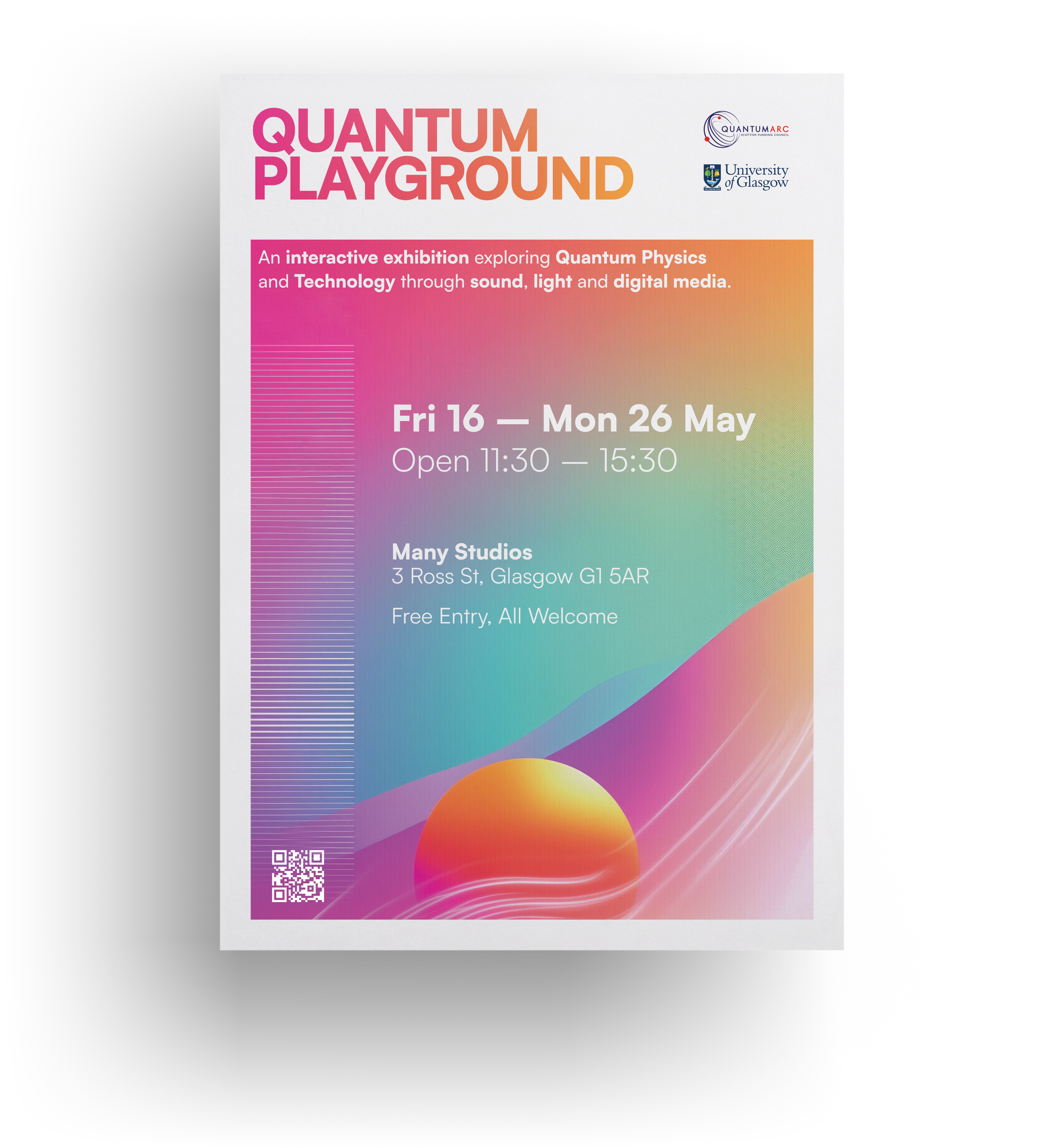 Das Plakat für „Quantum Playground“ wurde mit einem modernen, futuristischen Design gestaltet, das die interaktive Natur der Ausstellung visuell unterstreicht.